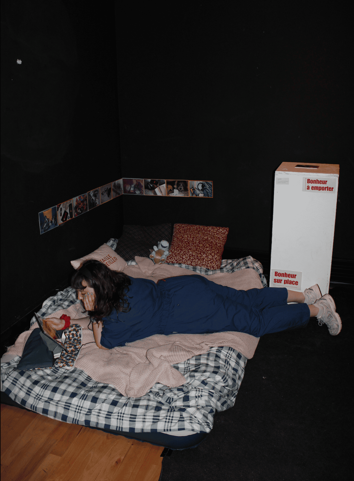 Une œuvre participative où des jeunes adultes, de 18 à 30 ans, sont invités à envoyer une photos d’un regroupement d’objets représentant leurs actions ou consommations en réponses à la douleur, physique et/ou morale. Ces images sont rassemblées en une série de cartes postales (Bonheur à Emporter) et permettent de créer une installation (Bonheur sur Place) qui regroupe les éléments revenus le plus souvent.