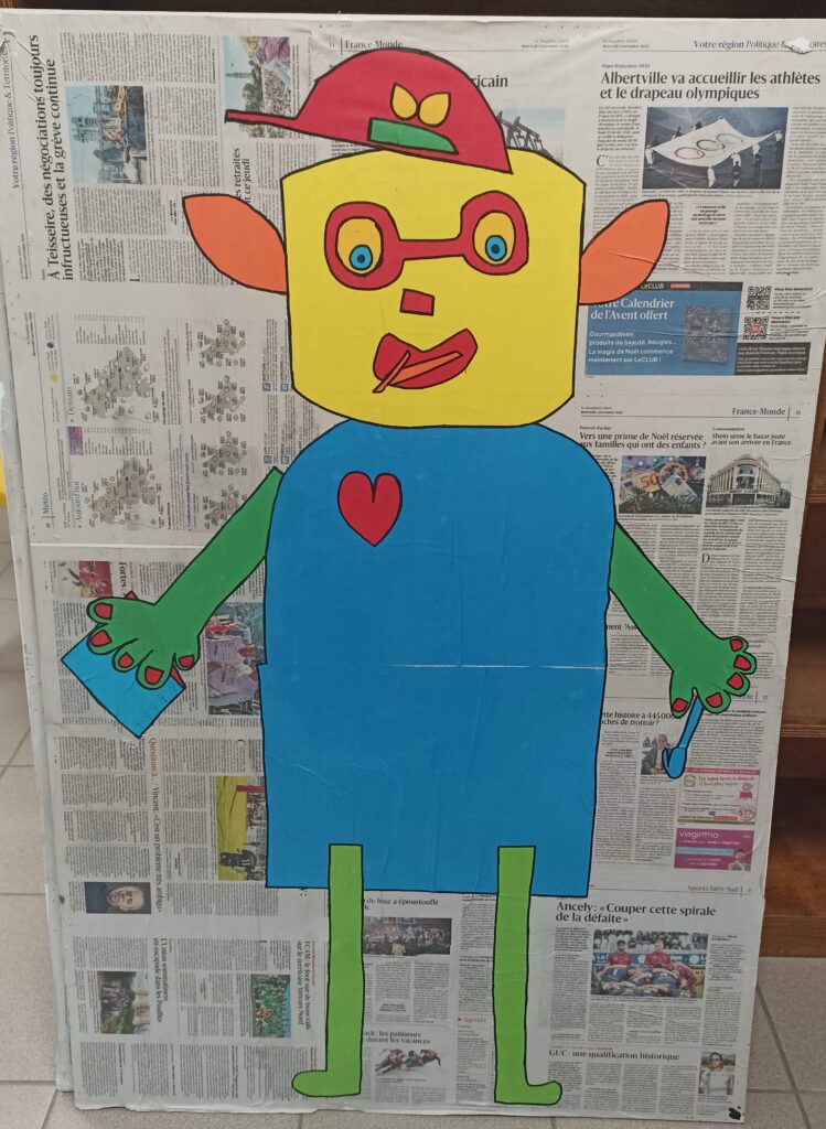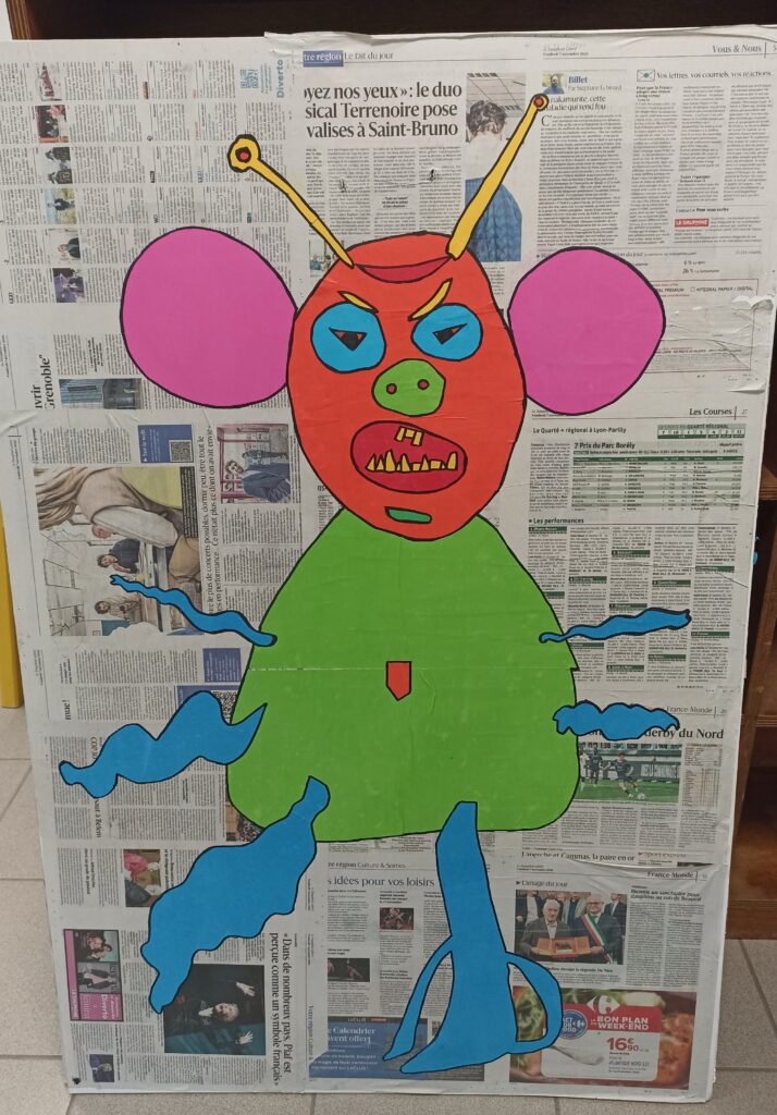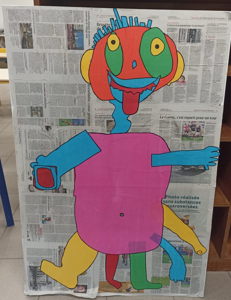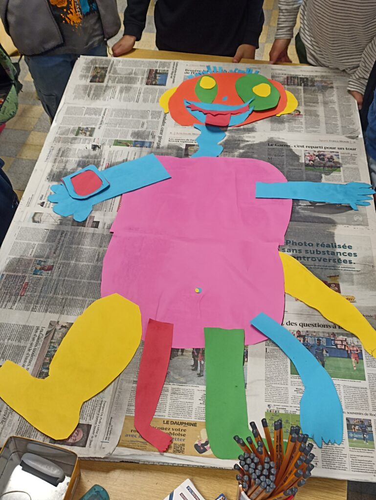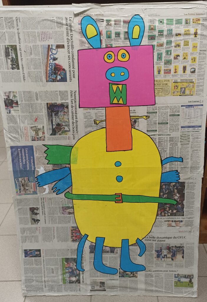 Créations collectives en collage de quatre créatures fictives reprenant les éléments listés par les élèves de CM2 pour créer les “témoins parfait”, ceux chargés d’avertir un adulte responsable s’ils sont témoins d’harcèlement.